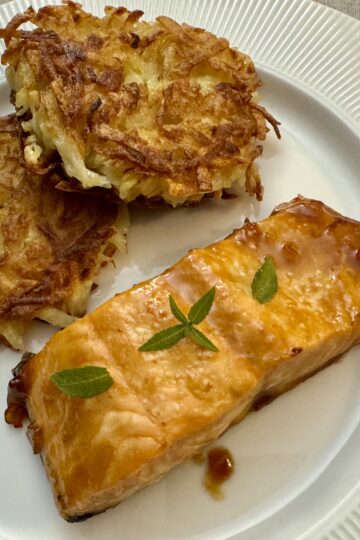 Double plaisir pour ce plat, avec un saumon sucré salé et des galettes de pomme de terre croustillantes