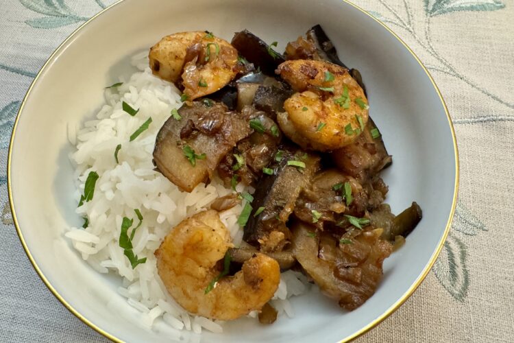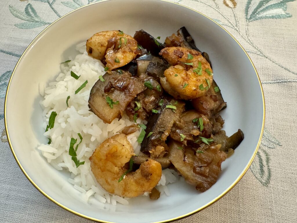 - Dressez les assiettes en mettant le riz puis le mélange aubergines / crevettes avant de rajouter un peu de ciboulette hachée