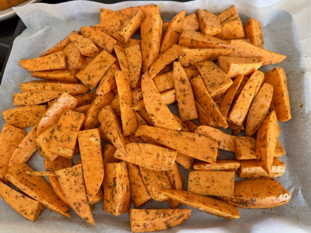 En enfin, pour accompagner ce plat, nous avons voulu changer de l’éternel riz, donc nous avons fait des patates douces au four en mode potatoes.