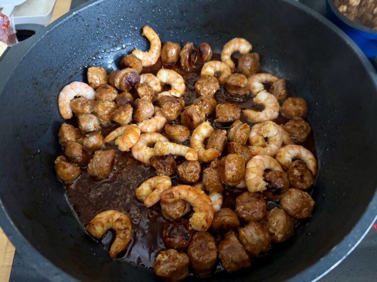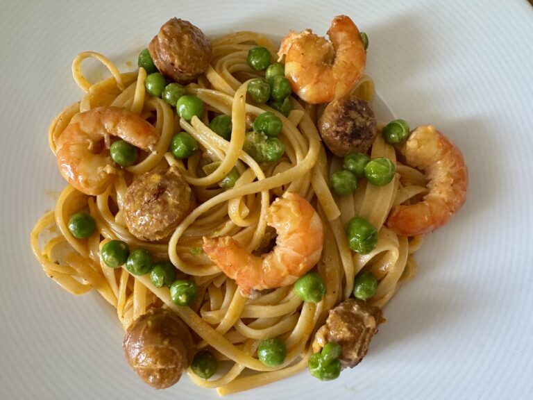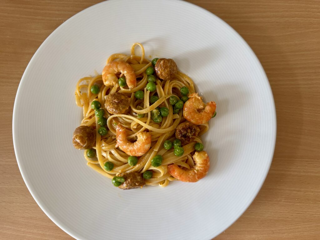 La recette d’origine était avec des tagliatelles, mais les linguine sont bien adaptées. Contrairement à la photo de la recette, il y a bien de la sauce. Suivant votre chorizo la sauce sera plus on moins relevée. Ici, le chorizo du boucher était bien dosé !