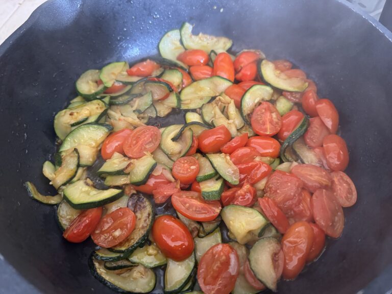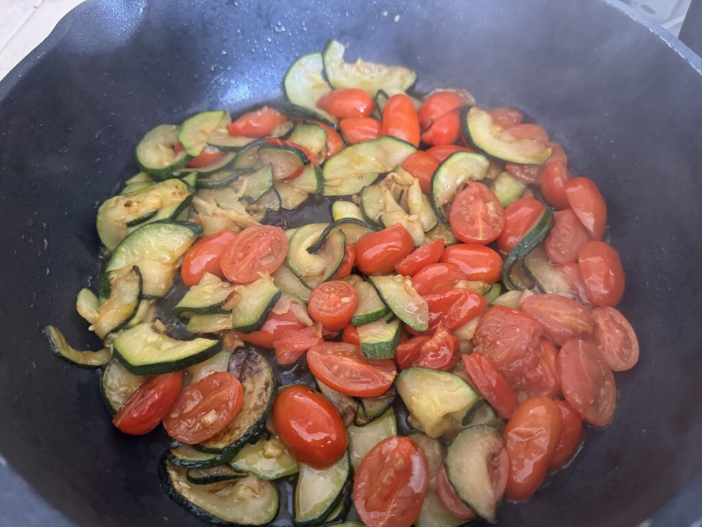 - Egouttez les en fin de cuisson et ajoutez les dans la poêle avec les courgettes et tomates