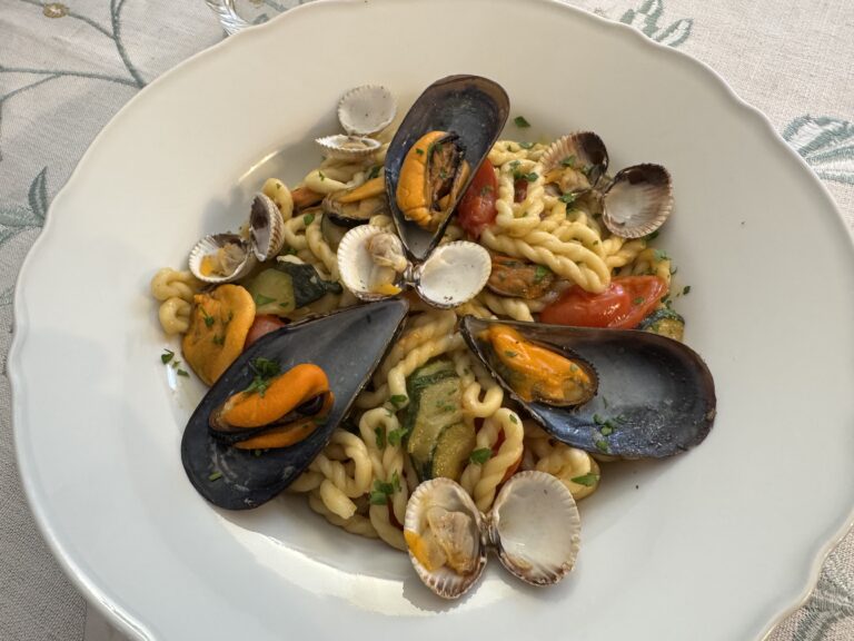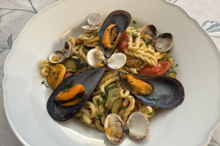 Pour ces pâtes sardes artisanales ramenées de voyage, il fallait bien trouver une recette qui les mette en valeur ! Nous avons mis des moules et des coques, mais vous pouvez mettre d’autres coquillages (la recette d’origine met des moules et des palourdes)