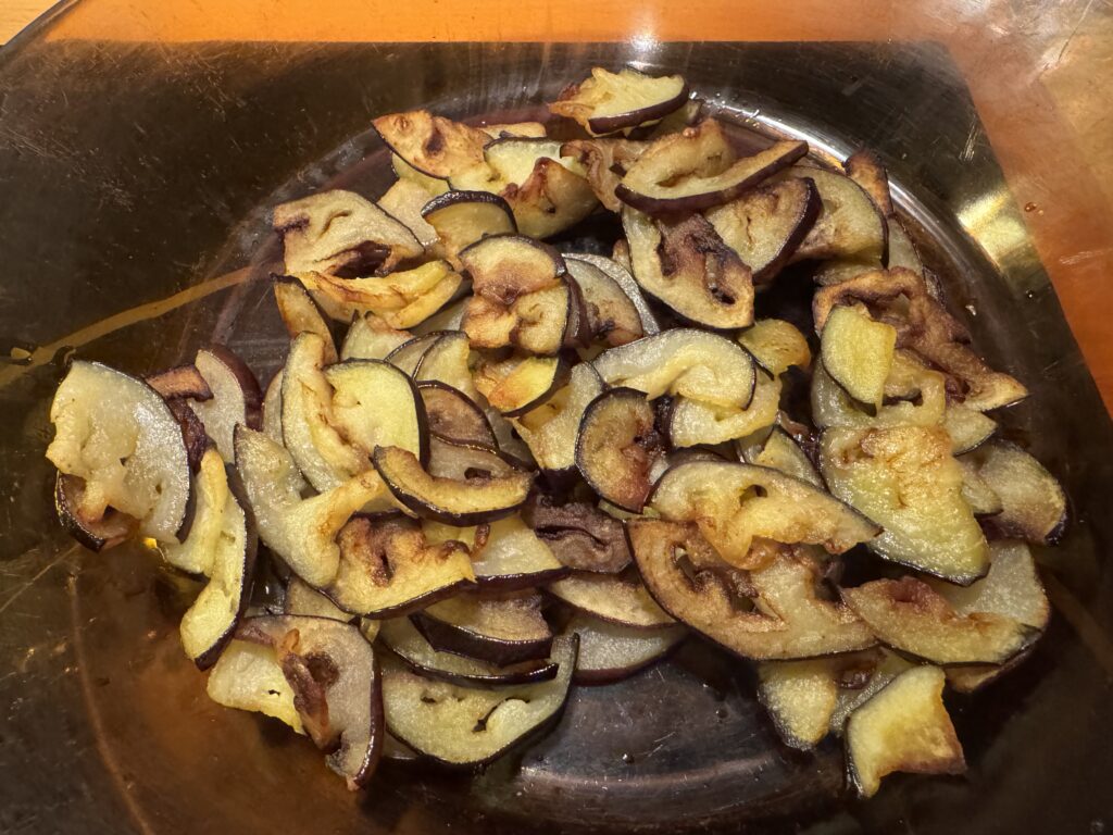 - Lavez et coupez les aubergines en 4 dans le sens de la longueur. Coupez ensuite les aubergines en tranches fines de 2/3 mm d’épaisseur