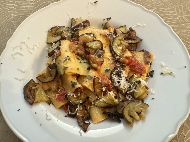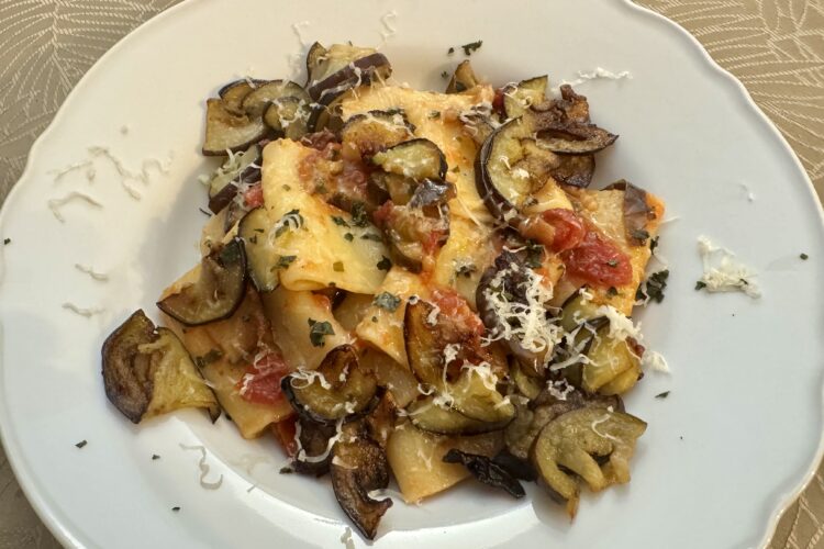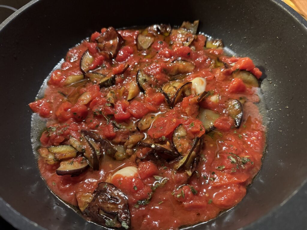 Cette recette traditionnelle de la cuisine sicilienne est normalement faite avec des rigatoni. Ici nous avons utilisé des Paccheri Lisci di Gragnano. Comme elles sont plus grosses que les rigatoni, elles se sont un peu écrasées. Mais le plat était bien bon !