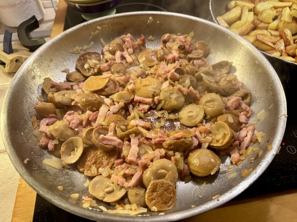 - Dans la même poêle mettez l’oignon émincé et les lardons, faites les revenir quelques minutes