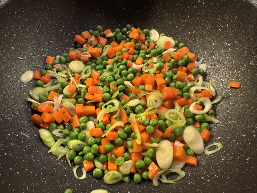 - Ajouter les petits pois et les carottes coupées en brunoise (petits cubes)