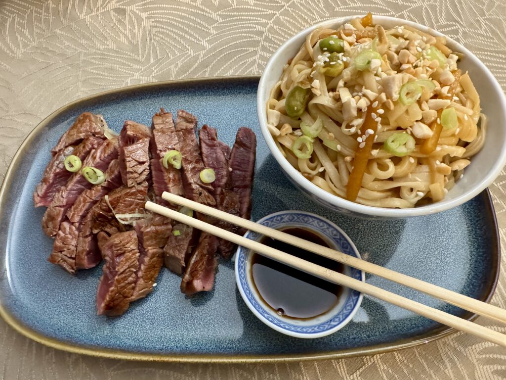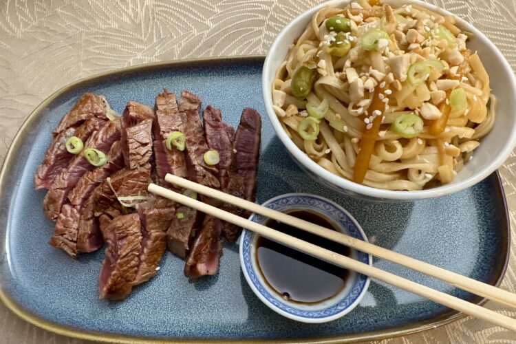 Attention, petit crush pour cette recette. Double recette d’ailleurs, car nous avons choisi d’accompagner ce boeuf préparé à la façon japonaise avec des nouilles udon aux légumes.