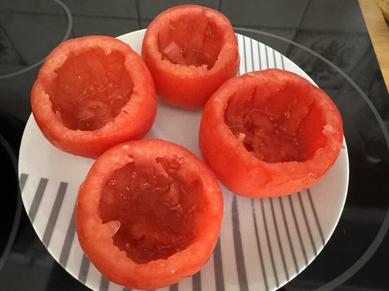- Lavez les tomates,, coupez le haut et videz l’intérieur avec une cuillère à soupe (gardez la chair)