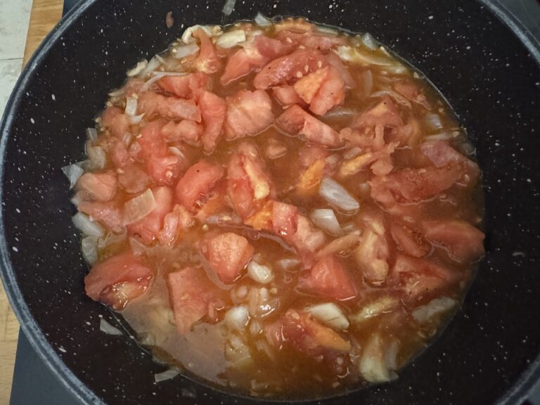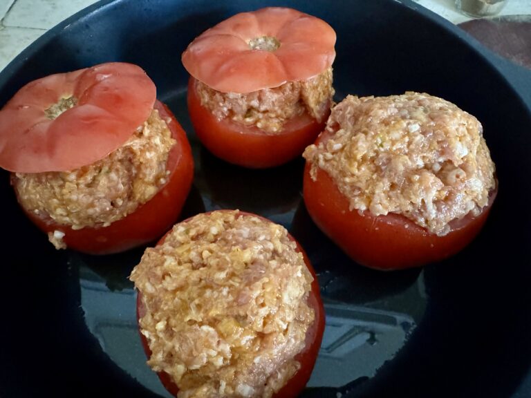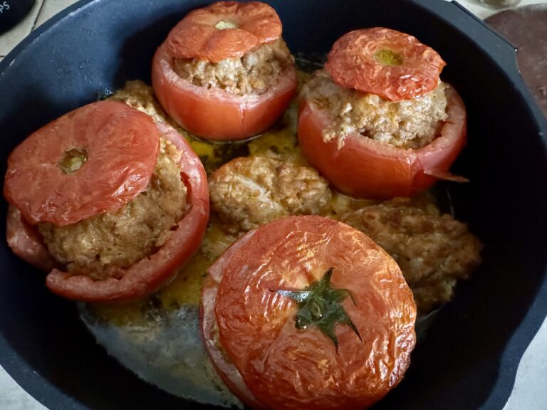 Dans la recette il était dit 20-25 minutes de cuisson, mais la viande à cœur n’était pas tout à fait assez cuite, donc en fonction de votre four et de la taille des tomates, n’hésitez pas à ajouter 5-10 minutes.