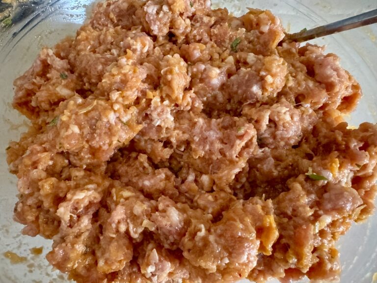- Pendant ce temps préparez la farce : mélangez les 2 viandes, l’œuf, un peu de piment d’espelette et une cuillère à café d’épices avec le persil haché