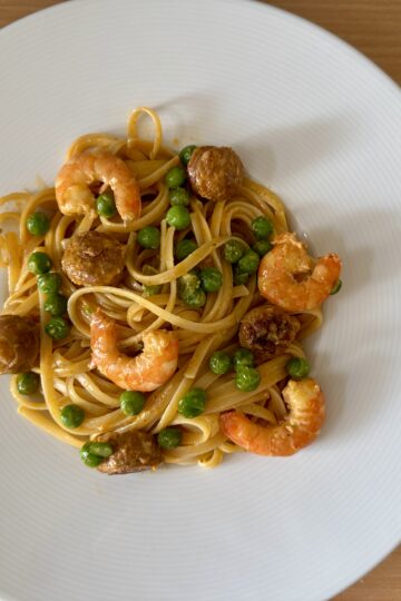 La recette d’origine était avec des tagliatelles, mais les linguine sont bien adaptées. Contrairement à la photo de la recette, il y a bien de la sauce. Suivant votre chorizo la sauce sera plus on moins relevée. Ici, le chorizo du boucher était bien dosé !